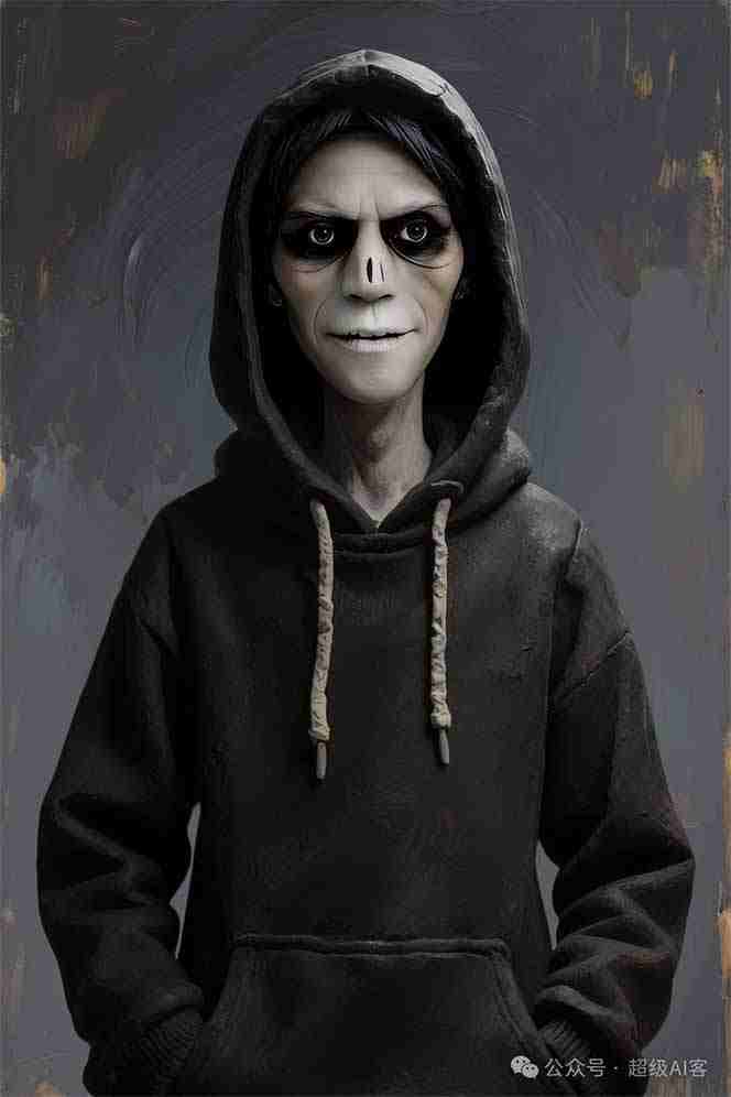 ***男子正对镜头,他的皮肤,是用厚涂技法(impasto)的油彩渲染出的病态惨灰白色,这个男子穿着一件黑色连帽衫)。强烈的明暗对照效果(Chiaroscuro)将他孤独的身影置于画面的视觉中心。